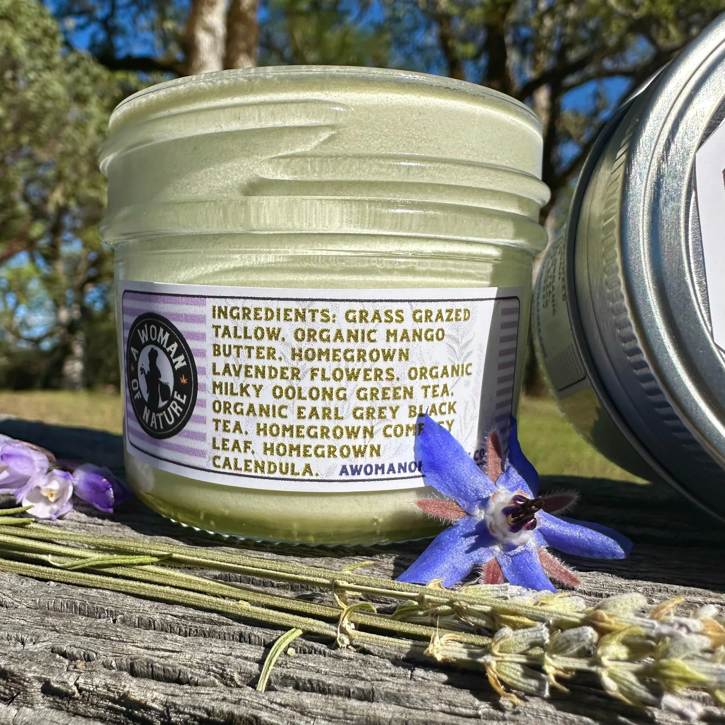 Homegrown lavender flowers, calendula, and comfrey leaf for gentle soothing and repair.